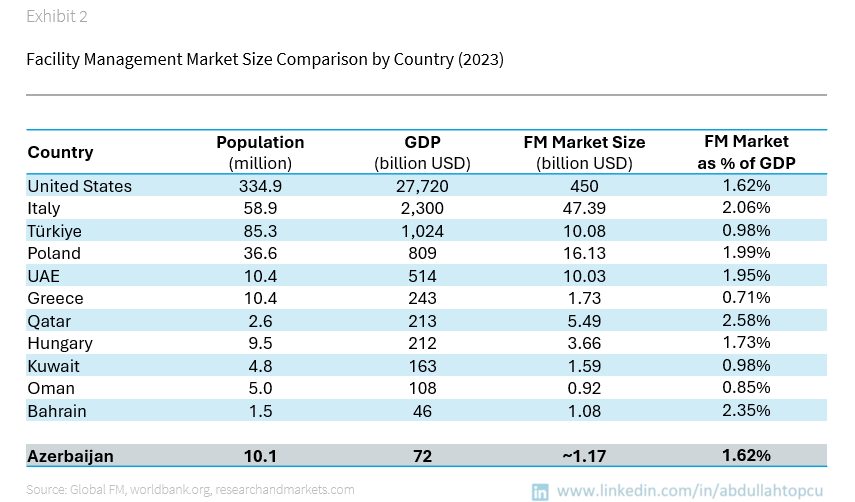 Determining the exact size of the Facility Management (FM) market in Azerbaijan is challenging due to the lack of publicly available data, the absence of sectoral reports, and limited information from companies operating in the field. However, insights can be drawn by analysing data from adjacent and comparable markets.