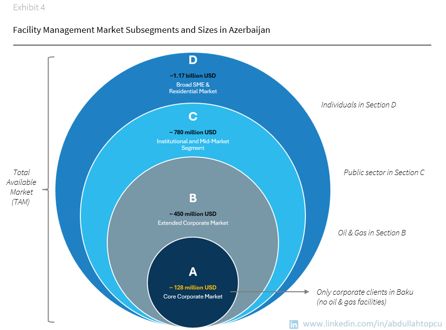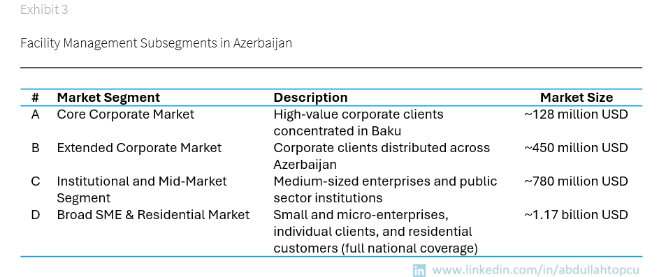 To better understand the structure and potential of the facility management (FM) industry in Azerbaijan, the market can be segmented into four distinct subcategories based on client type, geographic distribution, and service demand. These segments reflect varying levels of maturity, scale, and specialization, providing insight into where strategic growth and investment opportunities lie. The following exhibit outlines these FM subsegments, ranging from high-value corporate clients in Baku to broad residential and SME markets across the country.