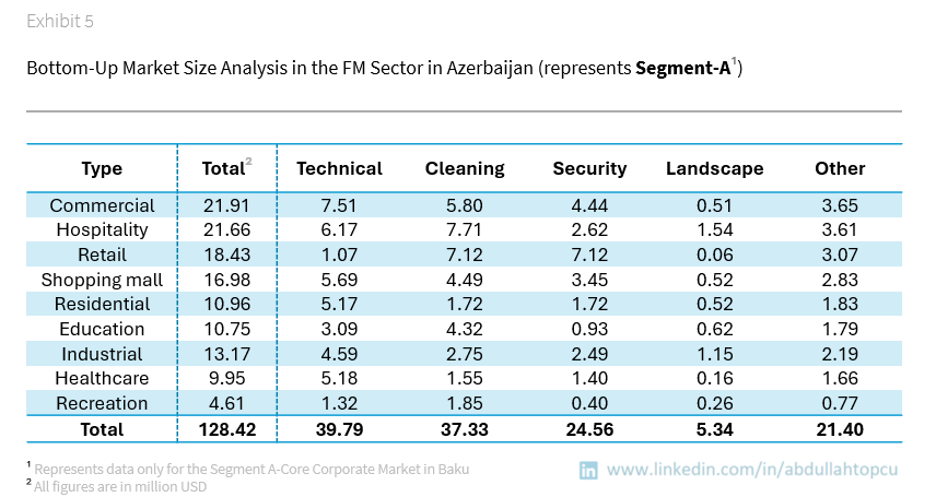 The estimated size of Market Segment A—the Core Corporate Market—is approximately 128 million USD. As shown in the table below, the commercial building sector constitutes the largest share of this segment, driven by the increasing demand for modern office spaces, business centers, and high-grade commercial facilities, particularly in Baku.