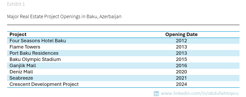 Azerbaijan has experienced a growing real estate market, especially over the past two decades. This dynamic market has been shaped by a variety of developers, mostly local. International construction firms, consultants, local developers, and engineering companies are active players, along with public institutions. The skyline of the capital city, Baku, is dramatically different compared to 20 years ago. Ongoing construction projects include mixed-use real estate developments, shopping malls, 4- and 5-star hotels, business towers, sports facilities, industrial complexes, and more.